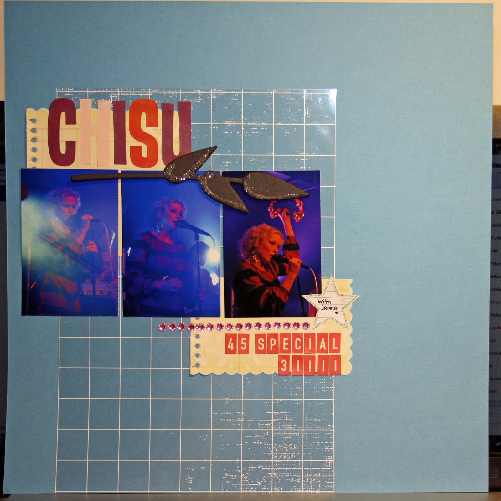 Eilen BB:n aikana vähän skräppäsin ja tässä tuotos. Tykkään ihan mielettömästi. Inspiroiduin jostain sivusta, jonka oon joskus tallentanu koneelle, mutta nyt ei oo enää mitään hajua, mistä se on. Onneksi nyt on Pinterest. Mulla on ihan jättimäiset silppupaperilaatikot ja tähän sain sentään jotain laitettua. Täytynee ottaa ihan asiaksi etsiä ensin sieltä sopivia papereita.